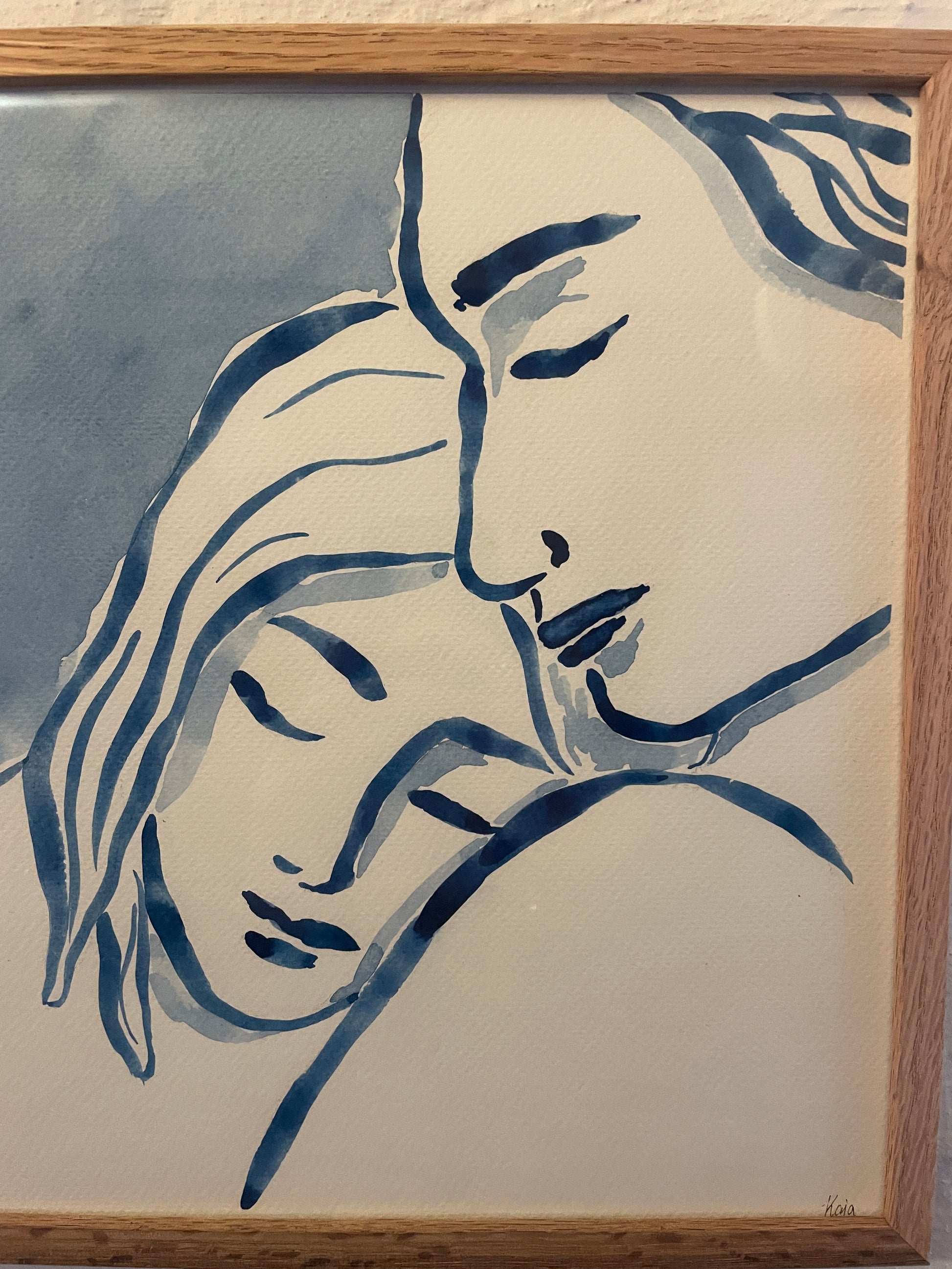 This is an original aquarelle painting - depicting two people, quietly embracing each other. Letting their guard down.